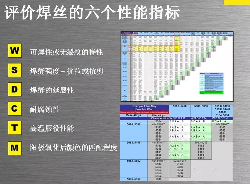 一種母材可以用多種鋁合金焊材完成焊接 ,如5083-5083的焊接:可用 5356,5183,5556 等焊絲。但是每一種焊絲得到的焊接接頭可能只能在某一個性能方面是**佳的。選擇**佳的焊絲時,主要應考慮焊接件的**終使用性能。整體來說,主要考察以下幾個性能指標: